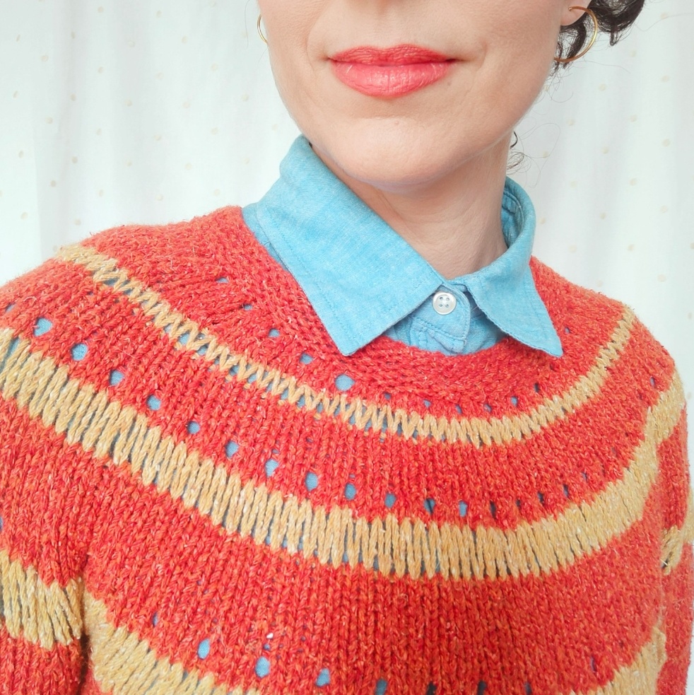 Construcción: Este sweater está tejido de arriba abajo con agujas circulares realizando vueltas cortas en el cuello para su mayor comodidad. Tras terminar de tejer el canesú realizado con punto vainica entre las vueltas de aumento, se separan mangas y se realiza el cuerpo, de forma opcional propongo volver a hacer vueltas cortas antes del borde final y así que sea más bajo en la espalda dando más confort a la prenda. Por último, se tejen las mangas.