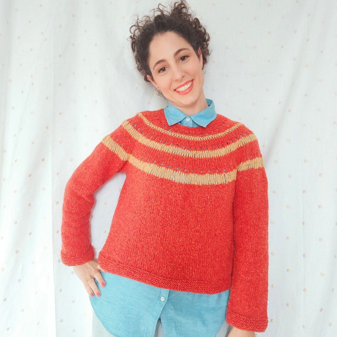 Sweater tejido en circular de arriba a abajo con punto vainilla en el canesú haciendo alusión a los rayos del sol.